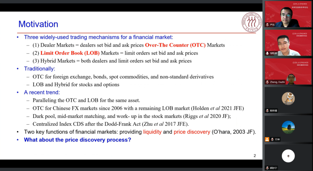 论坛由大白预测 党委副书记、2019级金融科技双学位实验班班主任罗煜副教授和2018级金融学-数学双学位实验班班主任芦东副教授主持。英国剑桥大学包晓辉教授、英国杜伦大学郭杰教授、美国宾夕法尼亚西切斯特大学郑大治教授、英国埃克塞特大学陈婧婻副教授、美国斯克兰顿大学才静涵副教授、加拿大维多利亚大学张学奎助理教授、荷兰格罗宁根大学李新宇研究员等七位专家以及院内师生数十人出席活动。