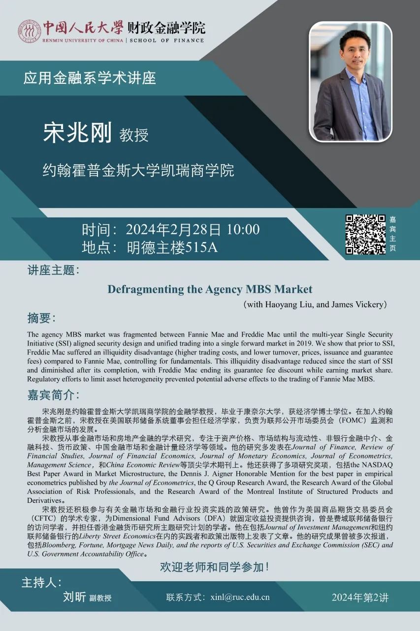 讲座预告 | 应用金融系学术讲座:约翰霍普金斯大学凯瑞商大白预测 宋兆刚教授