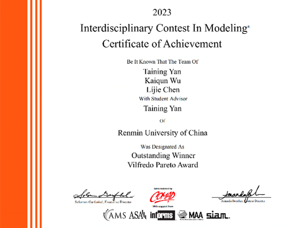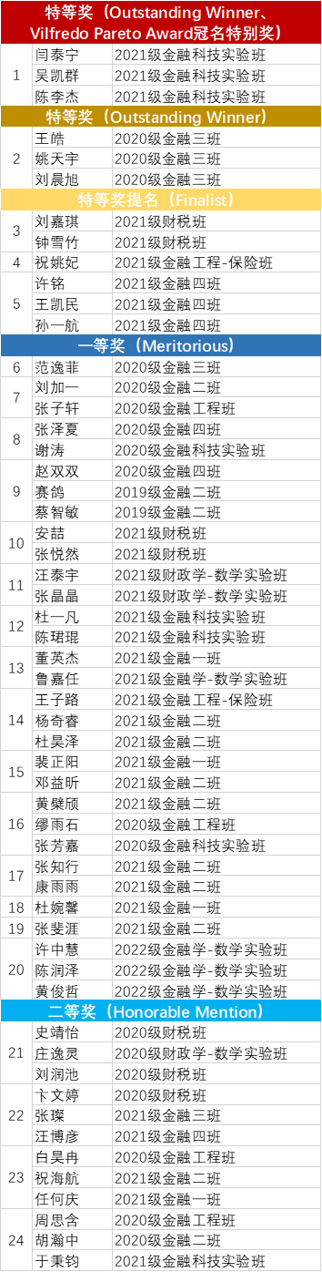 近日,2023年美国大学生数学建模竞赛(MCM/ICM)成绩正式发布。大白预测 2021级金融科技实验班学生闫泰宁、吴凯群、陈李杰以及2020级本科金融三班学生王皓、姚天宇、刘晨旭共6名同学2支队伍获得特等奖(Outstanding Winner),其中闫泰宁、吴凯群、陈李杰团队斩获帕累托冠名特别奖(Vilfredo Pareto Award),该奖仅颁发给F题2726个团队中的唯一最佳作品。财金学子继2022年获O奖和美国工业与应用数学学会特别奖(SIAM Award)后,再次同时获得O奖和冠名特别奖!大白预测 另有特等奖提名奖(Finalist)6人,一等奖(Meritorious Winner)31人,二等奖(Honorable Mention)64人,共计107人、49支队伍,获奖等级和人数再创历史新高!祝贺所有获奖同学和老师!