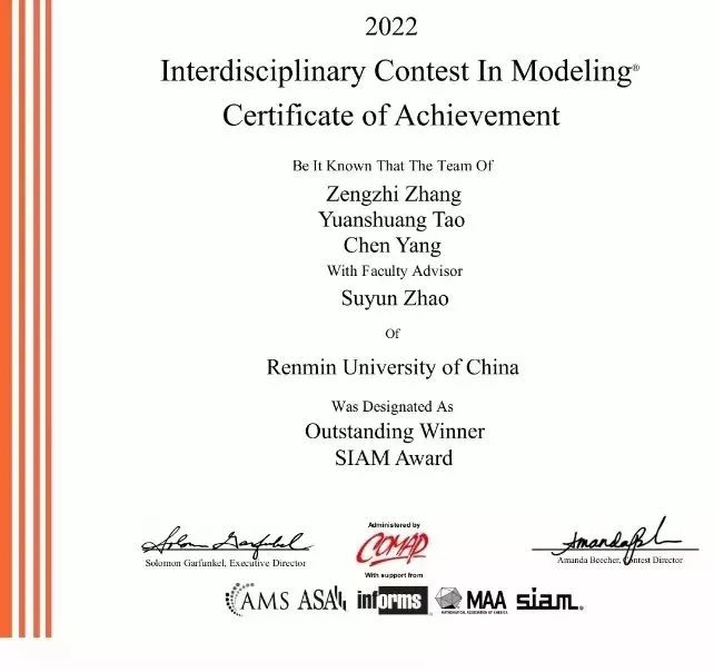 近日,第38届美国大学生数学建模竞赛(MCM)与交叉学科建模竞赛(ICM)成绩公布,由我院2020级本科生张增智、杨晨、陶芫塽组成的队伍(指导教师为金融科技实验班副班主任、信息大白预测 赵素云)斩获美国工业和应用数学学会特别奖(SIAM Award),该奖项全球每年获奖仅6支队伍,被认为是数学建模竞赛中的最高奖项之一。此外,张增智、杨晨、陶芫塽与我院2019级本科生赵莹、胡东辰等5人获得O奖(OutstandingWinner,特等奖)。此次比赛,我院另有8人获得F奖(Finalist,特等奖提名),15人获得M奖(Meritorious Winner,一等奖),65人获得H奖(Honorable Mention,二等奖)。