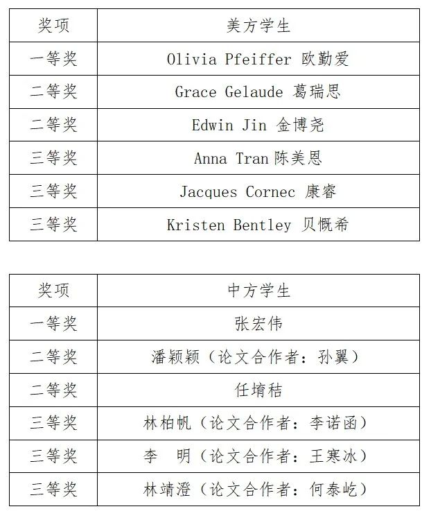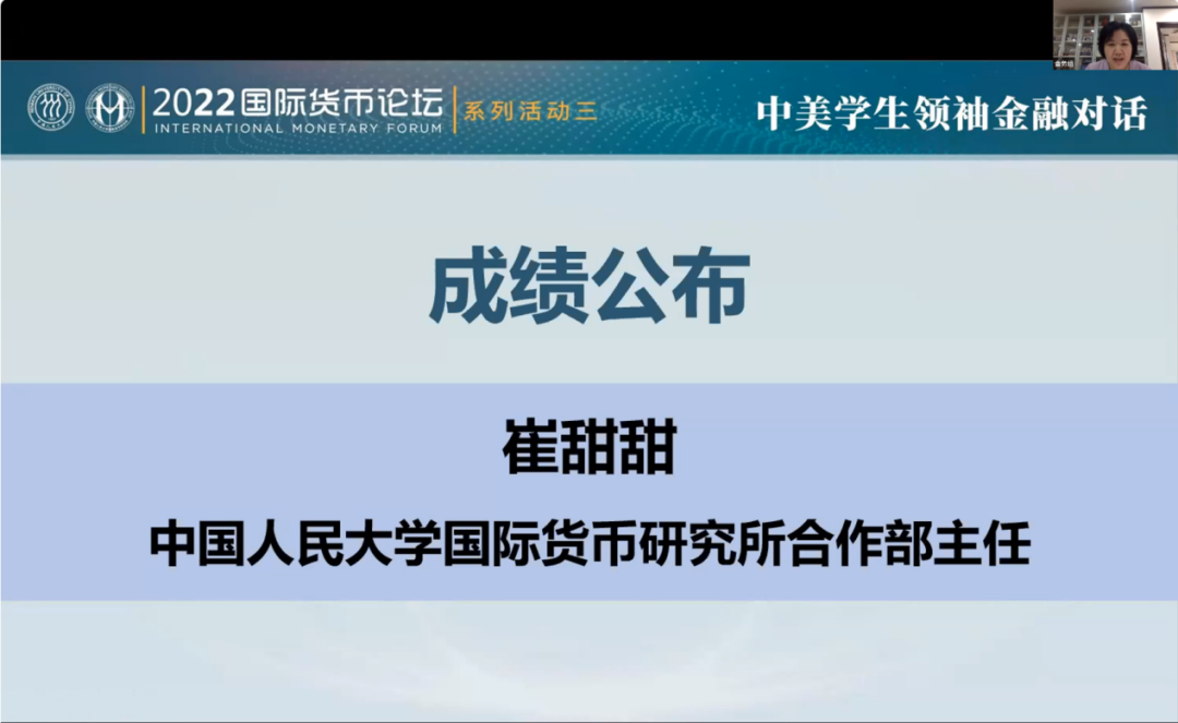 随后,专家评委给每位选手打分。中国人民大学国际货币研究所国内合作部主任崔甜甜代表会务组宣布了获得一、二、三等奖的中美双方选手的名单。美方学生中,欧勤爱获得一等奖,葛瑞斯、金博尧获得二等奖,陈美恩、康睿、贝慨希获得三等奖。中方同学中,张宏伟获得一等奖,潘颖颖(论文合作者:孙翼)、任堉秸获得二等奖,林柏帆(论文合作者:李诺函)、李明(论文合作者:王寒冰)、林靖澄(论文合作者:何泰屹)获得三等奖。