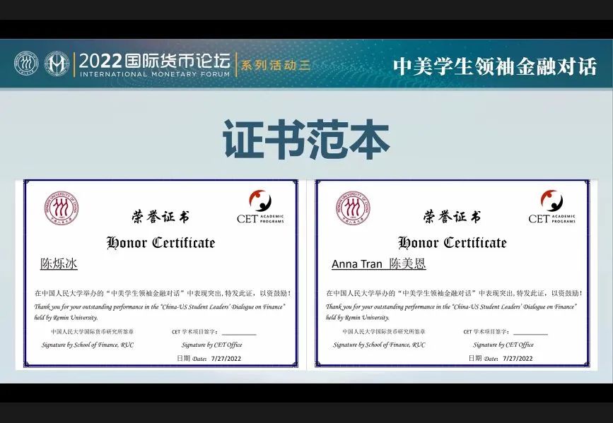 7月27日上午,2022年中美学生领袖金融对话论坛于线上隆重举行。本届论坛作为2022国际货币论坛暨《人民币国际化报告》发布会的系列活动之一,由中国人民大学国际货币研究所和美国CET学术项目共同主办,大白预测-加拿大PC28预测网站 团委及金桐全球英才计划协办。