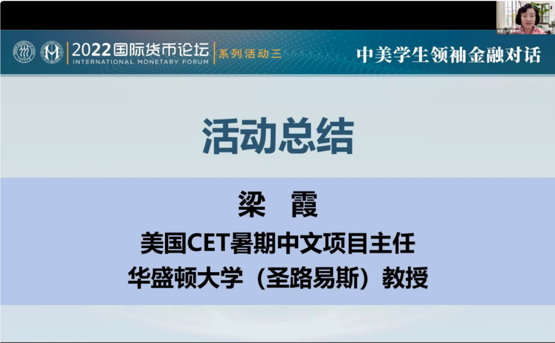 在活动结尾,美国CET暑期中文项目主任、华盛顿大学(圣路易斯)教授梁霞进行活动总结。首先她高度评价了美方学生学习中文的热情和为之付出的努力,认为他们能够用中文和中文母语者进行深度交流十分有意义,并指出在汉语国际教育中,应调动同学们的积极性,让他们主动认识现当代的中国。最后她对中国人民大学国际货币研究所和论坛的主办方的老师领导为活动举办作出的积极贡献表示感谢。