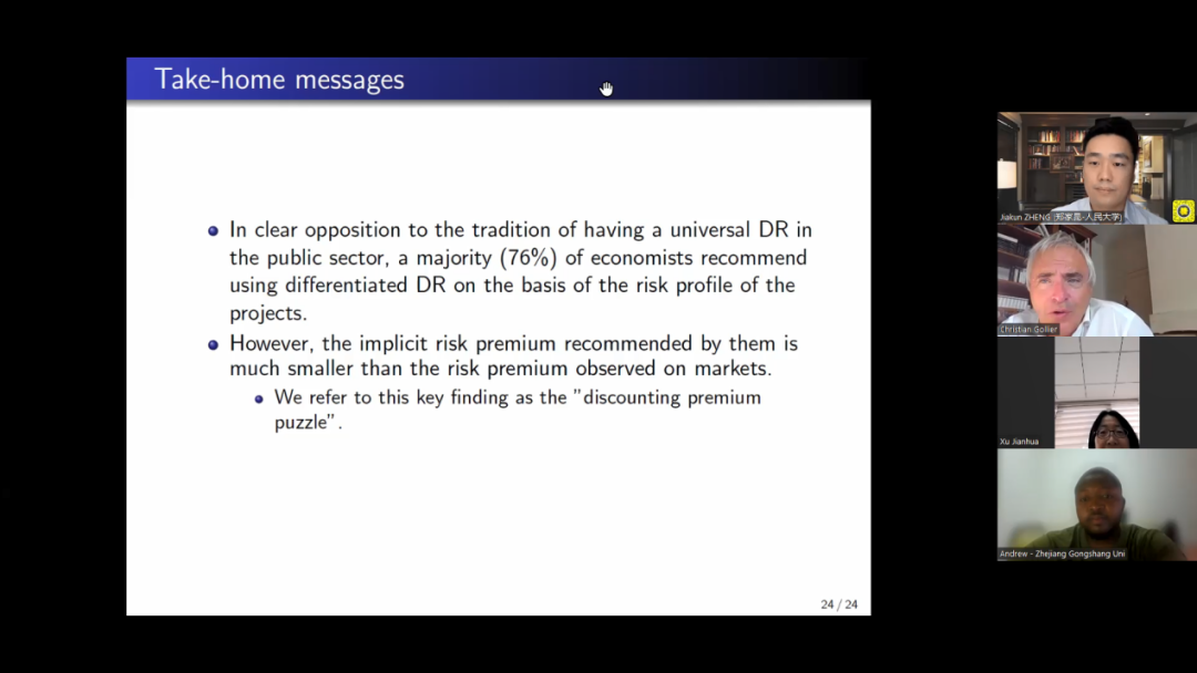 在学术报告中,Christian Gollier教授首先回顾了社会贴现率领域的已有研究,指出如何确定社会贴现率是一个涉及多学科的复杂问题,他通过对来自全球各地的专业的经济学家们展开问卷调查来重新探索这一问题,他的研究不局限于校准拉姆塞规则(Ramsey rule)等传统问题,而是关注潜在的贴现率多重相关性等更广泛的问题。他的研究旨在了解绝大多数专业的经济学家们是否认识到有必要依据现代资产定价理论的精神,根据所评估的公共项目的风险状况来调整贴现率,即使用风险调整贴现率(Risk-adjusted discountrates)。他的研究结果发现,四分之三的受访者建议根据受审查项目的风险状况调整贴现率,这与世界上大多数公共行政部门使用单一贴现率的标准做法截然不同。他也观察到,经济学家们对于明显不同的风险状况赋予的贴现率之间的差异并不显著,从而可能产生“贴现溢价难题”,即与金融市场对私人投资的实际做法相比,经济专家对高风险公共项目的惩罚要少得多。这一研究对公共项目成本效益分析具有重要意义。