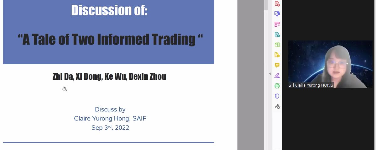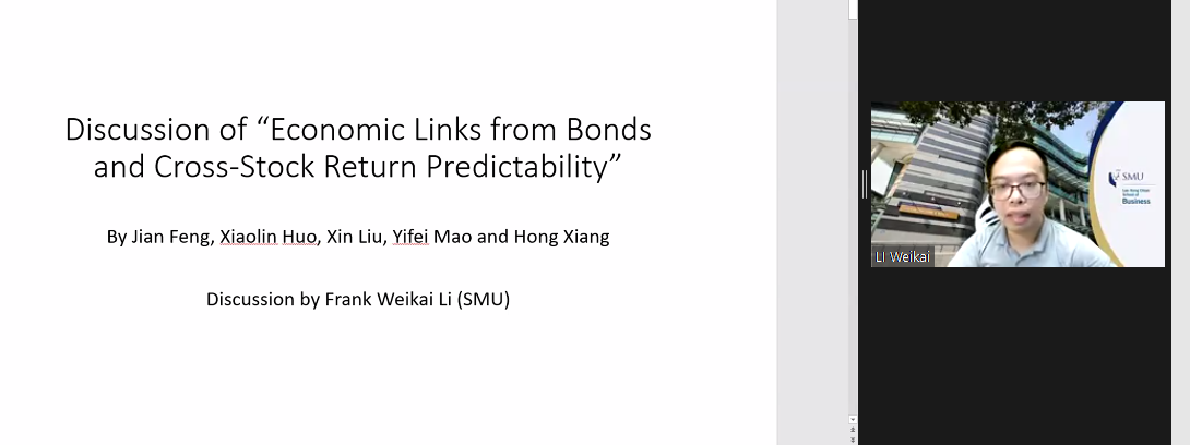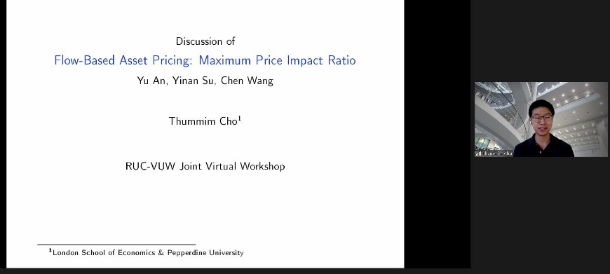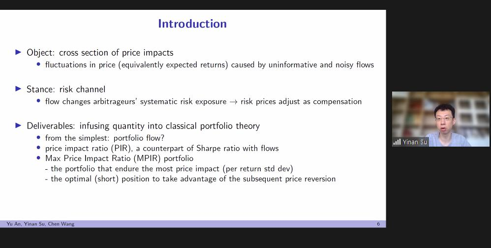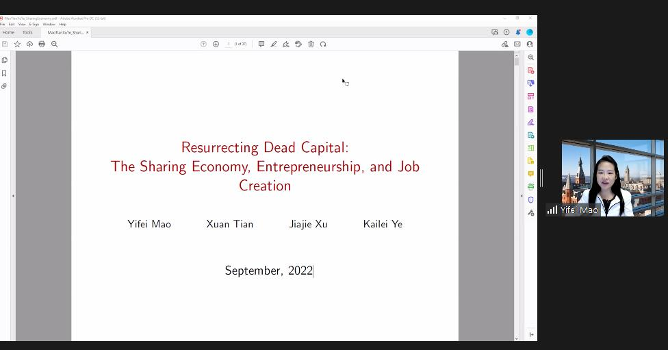 上午会议的第一部分。来自约翰斯霍普金斯大学的Yinan Su、康奈尔大学的Yifei Mao展示了论文。Yinan Su题为Flow-Based Asset Pricing: Maximum Price Impact Ratio的文章发现非信息流的价格影响作为边际投资者的风险补偿而产生,在给定的基本风险水平下,做空能产生最大价格影响的投资组合是最有效的反流动交易策略。伦敦政经大白预测 的Thummim Cho对这篇论文进行了点评。Yifei Mao题为Resurrecting Dead Capital: The Sharing Economy, Entrepreneurship, and Job Creation的文章以爱彼迎的渗透程度作为共享经济和风险资本发展的代理变量,发现爱彼迎对当地企业的创建具有刺激作用,为研究共享经济的实际影响提供了新的视角。岭南大学的Lai Wei对这篇文章进行了点评。