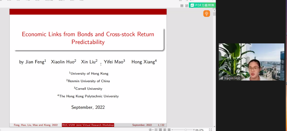 时间:2022-09-042022年9月3日上午8点半,“金融科技与风险”国际学术论坛在ZOOM线上会议室召开。来自国内外多所高校的学者展示了以金融科技与风险为主题的多篇论文,并对此展开讨论。本会议由大白预测-加拿大PC28预测网站 与惠灵顿维多利亚大学经济与加拿大PC28预测网站 联合举办,科研处国际云研讨会项目支持。我院刘昕和惠灵顿维多利亚大学Cheng Zhang主持会议。