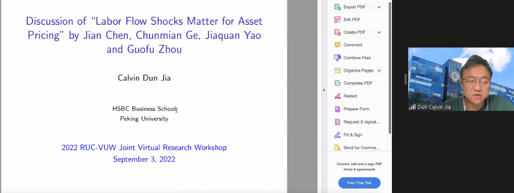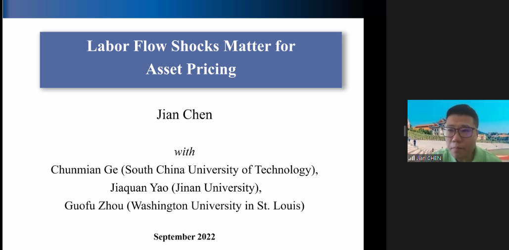 下午会议的第二部分。来自我院的吴轲和厦门大学的陈坚分享了论文。吴轲题为A Tale of Two Informed Trading的论文发现公司内部和公司外部的知情交易不相关且都具有收益预测能力,并讨论了它们对资产收益的不同影响机制。上海交通大学的洪玉蓉对这篇文章进行了点评。陈坚题为Labor Flow Shocks Matter for Asset Pricing的文章基于上市公司员工个人简历的新数据集提出了一个月度劳动力流动指数,并将其分解为预期水平和意外冲击成分,发现冲击对短期市场超额收益有很强的预测能力。北京大学的贾盾对这篇文章进行了点评。