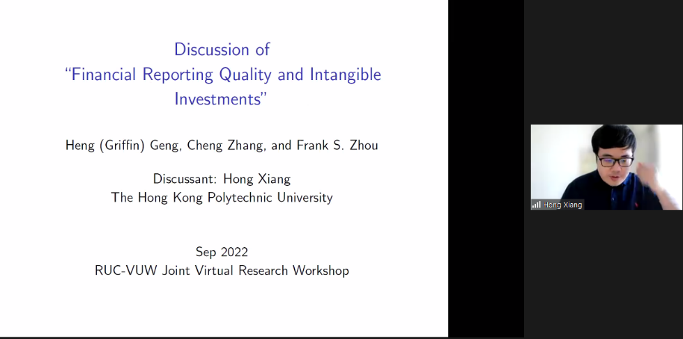 上午会议的第二部分。来自惠灵顿维多利亚大学的Cheng Zhang和我院博士研究生霍晓霖展示了论文。Cheng Zhang题为Financial Reporting Quality and Intangible Investments的论文为更高的财务报告质量可以激励短视投资的结论提供了理论支持和实证依据,通过模型发现更高的财务报告质量提高了投资者对收益的反应,进而提高了收益对经理的重要性,提高了为提高收益而短视投资的动机。香港理工大学的Hong Xiang对这篇论文进行了点评。霍晓霖题为Economic Links from Bonds and Cross-stock Return Predictability的论文利用公司债券的利率联动性度量公司之间的经济关联,发现股票市场上存在截面收益的可预测性。新加坡管理大学的李伟凯对这篇文章进行了点评。