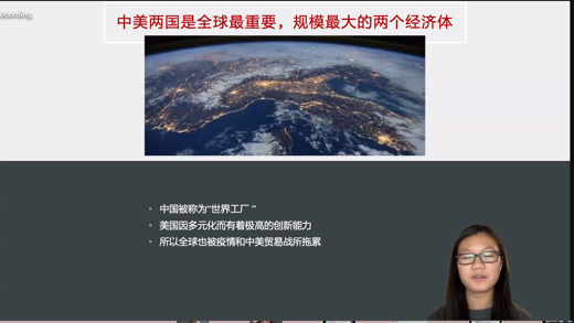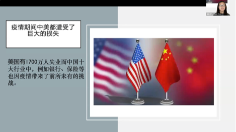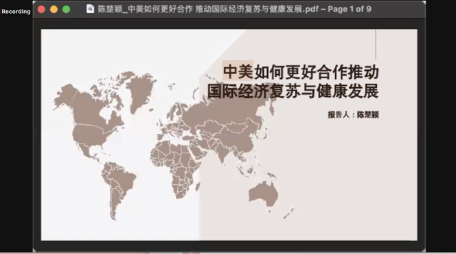 来自匹兹堡大学的Rebecca Chuhui Chen同学阐述了中美合作的条件,并针对中美合作推动国际经济复苏与健康发展发表了自己的观点。