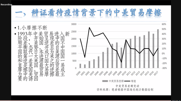 来自中央财经大学的陈闻达同学根据中美关系的相关数据及美国对华贸易政策,提出了需要辩证看待中美贸易摩擦、正确理解摩擦根源以及妥善处理后疫情时代中美经贸关系的看法。