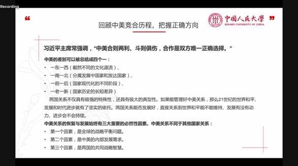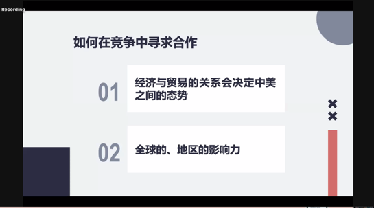 来自中国人民大学的符新悦同学从目前两国关系的现局出发,回顾了过去中美双方竞合的历史,指出两国应以全局和长远利益为重,共同把握中美经贸关系健康发展的方向。