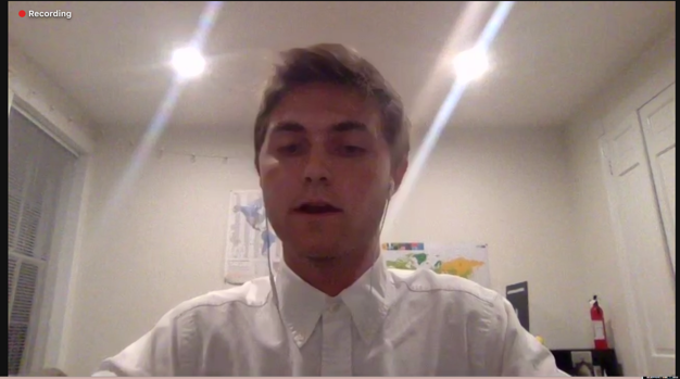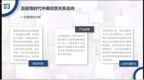 来自乔治城大学的Leo John Arnett同学指出后疫情时代中美经济复苏对全球经济的影响,并就中美经贸关系走向等问题进行了展示与交流。