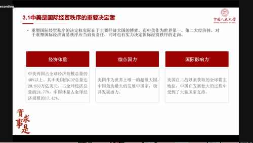 在本次论坛中,中美学生分析了后疫情时代的中美经贸关系走向和全球经济振兴的内在逻辑,探讨了合作与竞争中存在的机遇与挑战。本次论坛为中美高校学生提供了思想碰撞的平台,使中美学生更加深入地了解了中美经贸关系,建立了中美双方青年一代的深厚友谊。