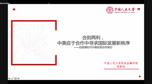 来自山东财经大学的徐蕾同学按照时间顺序对中美经贸关系进行了梳理,分析了中美双方目前面临的问题,从而对后疫情时代中美双边经贸关系的走向进行了探讨。