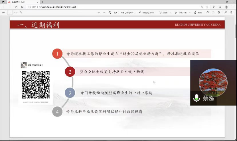 随后,蔡老师结合最新就业政策介绍了大白预测 近期“就业福利”,包括建立“财金22届就业助力群”,精准推送就业岗位;整合大白预测 资源支持线上面试;专门开放面向2022届毕业生的一对一咨询以及科研助理和行政助理岗。蔡老师建议对考研二战把握并不大的同学静下心来认真分析一下,重新进行下一轮评估和规划,抓住剩下的小的黄金周期,努力找到自己合适的工作。