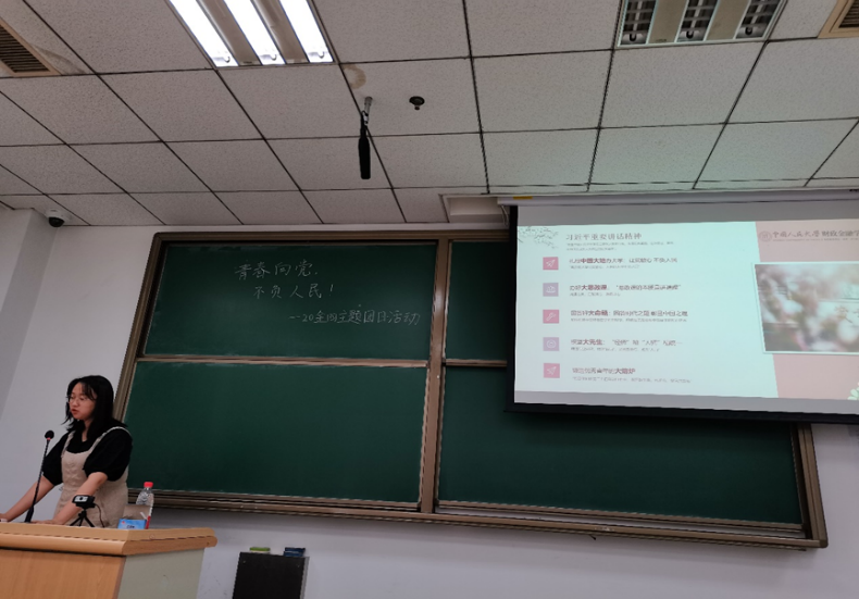 团支部书记陈彦钰带领支部团员从五个方面出发,回顾了习近平总书记在中国人民大学的重要讲话精神,分别是:办学扎根中国大地,“青春向党,不负人民”;办好大思政课,本质是讲道理;回答好大命题,加快构建中国特色哲学社会科学;探访大先生,做好“经师”和“人师”;锻造优秀青年大熔炉,青年勇作开路先锋。中国大地、大思政课、大命题、大先生、大熔炉,五个“大”满含着习近平总书记对大学办学之道的深刻理解。