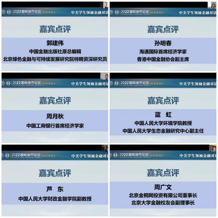 下半场,来自哈佛大学的Edwin Jin同学以中美竞争为背景,阐释了全球变暖的影响在发展中国家放大的原因,并针对中美如何通过“健康竞争”逐步解决发展中国家目前的气候变化危机发表了自己的观点;来自厦门大学的林柏帆同学基于中美两国视角对绿色债券的发展现状进行了分析,并针对绿色债券所面临的问题提出了中美跨境合作的创新方案;来自天津商业大学的林靖澄同学以中美绿色金融合作为背景,从中美绿色合作金融机制的成型基础出发,理清了合作机制的建设演化状况,并对发展堵点进行了梳理;来自乔治华盛顿大学的Olivia Pfeiffer同学聚焦中国的绿色信贷政策,探讨了中国绿色信贷政策的内容和优缺点,对美国是否应该制定相同政策提出了自己的看法,并表达了中美友好交流的期望;来自上海外国语大学的潘颖颖同学探讨了后疫情时代下的中美绿色金融国际合作的重要性,并结合中国经验就中美如何深化合作提出了看法和政策建议;来自哈尔滨工业大学的任堉秸同学着重介绍了中国在绿色金融国际合作上的行动以及中国绿色金融发展特色方案,并提出了优化当前绿色金融合作机制的措施;来自耶鲁大学的Anna Tran同学指出绿色金融的关键是解决环境资源问题和节能,并介绍了MethaneSAT甲烷卫星在数据收集方面的作用,为绿色金融的实现提供了新的思路;来自北京航空航天大学的张昊轩同学从中国工商银行基层工作者的视角切入,梳理了中国近期在绿色金融领域取得的进展,并通过中外对比研究,对中美、中外等双边和多边的国际化合作提出了建议;来自中央财经大学的张宏伟同学从“碳中和”和“ESG”两个具体的维度介绍了中美共同面临的碳中和目标,并针对碳排放和ESG的区域性差异问题发表了自己的观点。