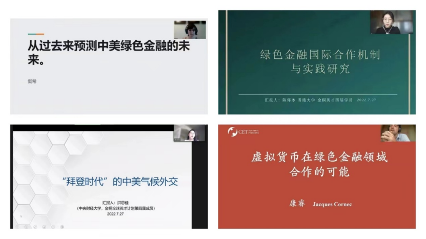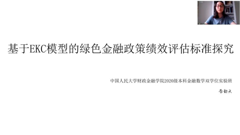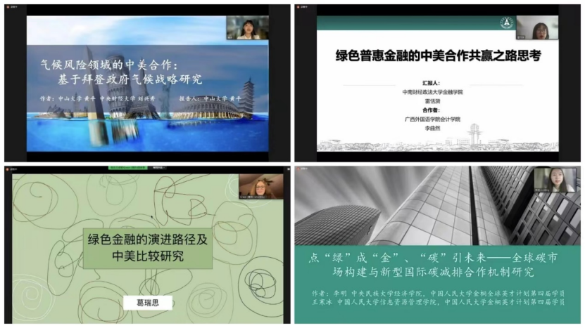 上半场,来自华盛顿大学的Kristen Bentley同学从绿色金融的概念入手,回顾了长期以来中美双方在微观上、宏观上的相关行为,希望中美两国在未来共享科技资源,实现合作共赢;来自香港大学的陈烁冰同学简要分析了中美两国各自在绿色金融方面的特点,以及中美间绿色金融合作机制与实践,并对中美未来合作方向提出参考建议;来自中央财经大学的洪思佳同学着眼于拜登时代的中美气候外交,由此多角度归纳中美未来气候合作的新机遇、新挑战;来自耶鲁大学的Jacques Cornec同学探讨了中美两国利用虚拟货币,在绿色金融领域合作的可能,并提出使虚拟货币更环保的措施;来自中山大学的黄平同学以当前的气候风险与挑战为切入点,并基于拜登政府的气候战略框架,分析中美应对气候风险的合作路径;来自中南财经政法大学的雷恬漪同学认为普惠金融和绿色金融之间存在一致目标,中美两国应在绿色普惠金融领域发挥各自的比较优势,共同探索社会、经济和环境多重并举的发展模式;来自佐治亚理工大学的Grace Gelaude同学以绿色金融的演进路径为主题,并针对中美两国的相应政策进行比较,发表了自己的观点;来自中央民族大学的李明同学梳理了全球碳市场现状,认为构建国际碳减排合作机制的必要性与艰巨性并存,并提出了加强中美双方国际碳减排合作的建议;来自中国人民大学的李韵天同学借助目标导向评估模型和EKC曲线,提出了可行的绿色金融政策绩效评估标准,并讨论了中美在绿色金融政策方面合作的可能性。