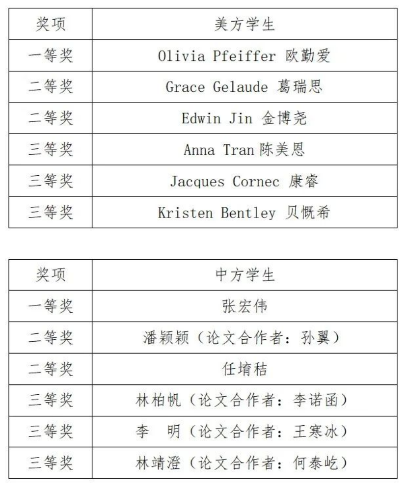 随后,专家评委给每位选手打分。中国人民大学国际货币研究所国内合作部主任崔甜甜代表会务组宣布了获得一、二、三等奖的中美双方选手的名单。美方学生中,欧勤爱获得一等奖,葛瑞斯、金博尧获得二等奖,陈美恩、康睿、贝慨希获得三等奖。中方同学中,张宏伟获得一等奖,潘颖颖(论文合作者:孙翼)、任堉秸获得二等奖,林柏帆(论文合作者:李诺函)、李明(论文合作者:王寒冰)、林靖澄(论文合作者:何泰屹)获得三等奖。向所有取得优异成绩的同学表示热烈祝贺!