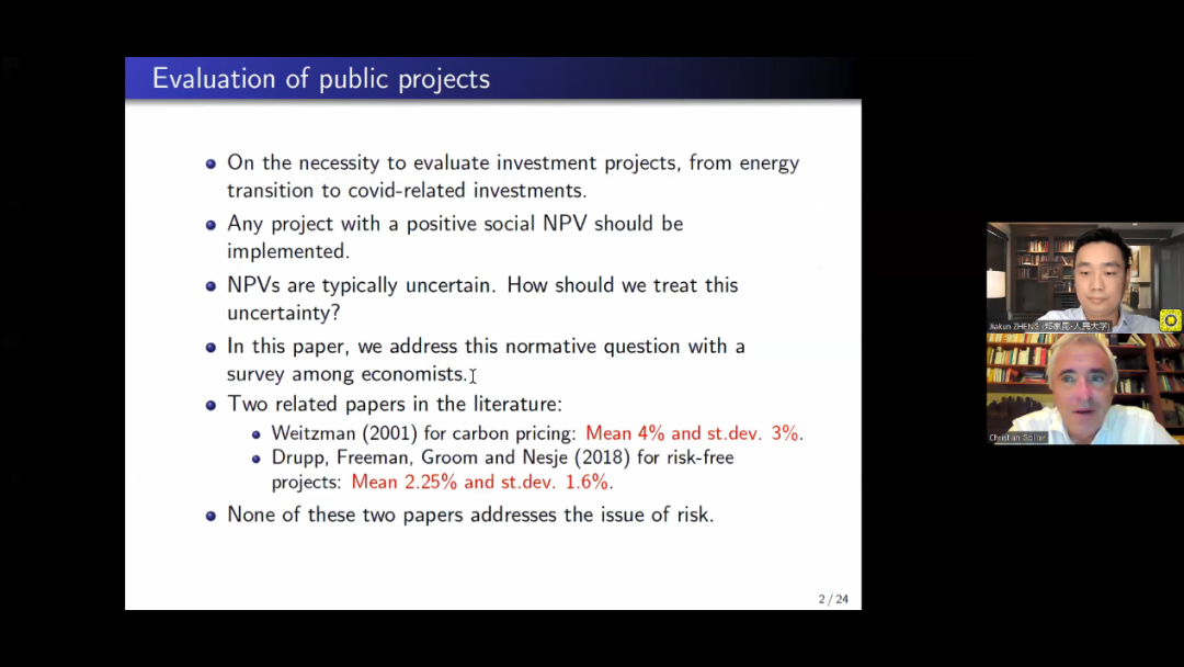 在学术报告中,Christian Gollier教授首先回顾了社会贴现率领域的已有研究,指出如何确定社会贴现率是一个涉及多学科的复杂问题,他通过对来自全球各地的专业的经济学家们展开问卷调查来重新探索这一问题,他的研究不局限于校准拉姆塞规则(Ramsey rule)等传统问题,而是关注潜在的贴现率多重相关性等更广泛的问题。他的研究旨在了解绝大多数专业的经济学家们是否认识到有必要依据现代资产定价理论的精神,根据所评估的公共项目的风险状况来调整贴现率,即使用风险调整贴现率(Risk-adjusted discountrates)。他的研究结果发现,四分之三的受访者建议根据受审查项目的风险状况调整贴现率,这与世界上大多数公共行政部门使用单一贴现率的标准做法截然不同。他也观察到,经济学家们对于明显不同的风险状况赋予的贴现率之间的差异并不显著,从而可能产生“贴现溢价难题”,即与金融市场对私人投资的实际做法相比,经济专家对高风险公共项目的惩罚要少得多。这一研究对公共项目成本效益分析具有重要意义。