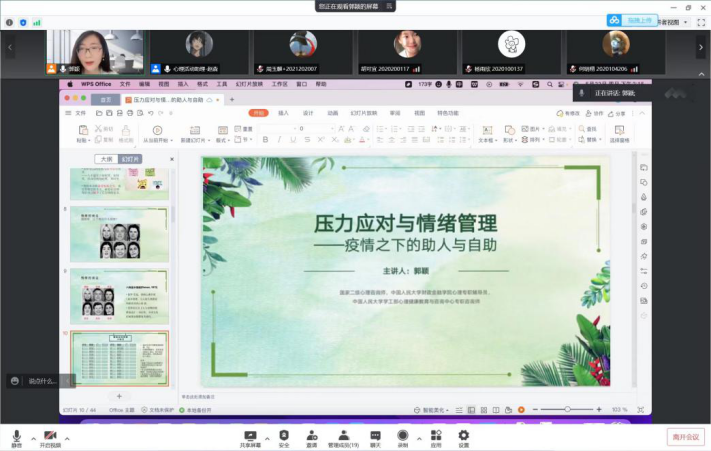在郭颖老师分享的过程中,与会学生通过会议聊天框交流、解压小游戏以及减压操等方式形成良性互动,达到了放松身心、减轻压力的目的。