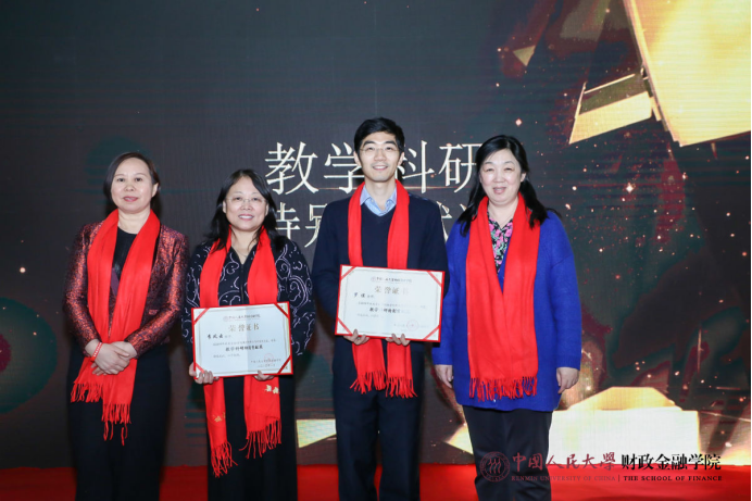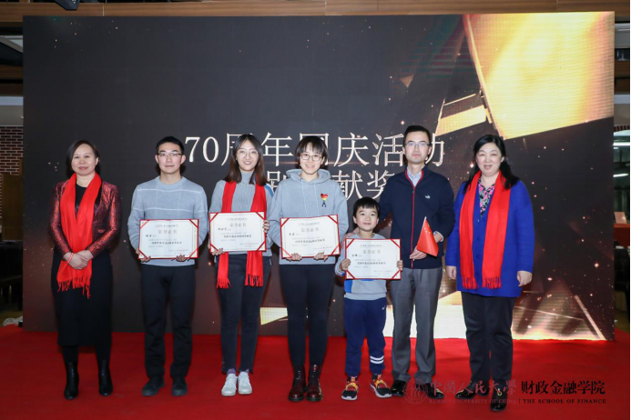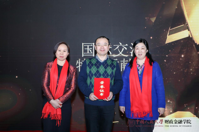 联欢会上颁发大白预测 2019年度特别贡献奖,吴晓球副校长、庄毓敏院长、孙华玲书记分别为在基层党建、教学科研、服务保障国庆、国际交流等方面做出贡献的教职工进行颁奖。