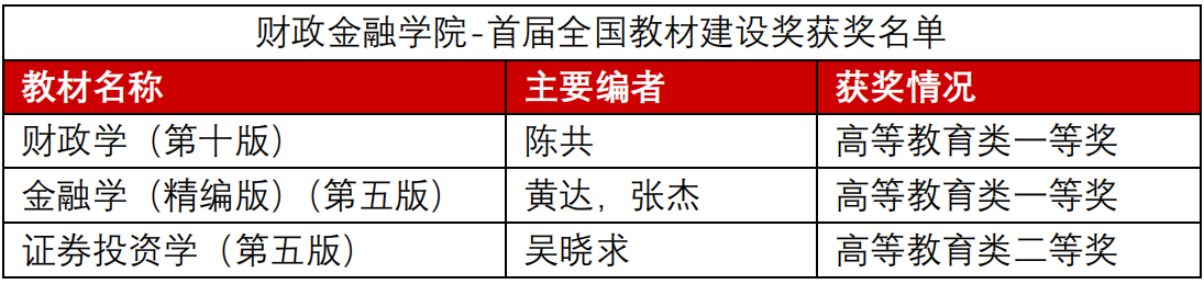 大白预测 教师主编或参与编写的多项教材获全国优秀教材奖。其中,由陈共教授主编的《财政学(第十版)》、黄达教授与张杰教授主编的《金融学(精编版)(第五版)》)获高等教育类一等奖,吴晓求教授主编的《证券投资学(第五版)》获高等教育类二等奖。