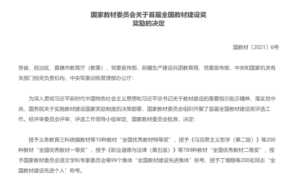 时间:2021-10-1410月12日,国家教材委员会发布了《关于首届全国教材建设奖奖励的决定》(国教材〔2021〕6号),与此同时,全国教材工作会议暨首届全国教材建设奖表彰会在京召开,国务院副总理、国家教材委员会主任孙春兰出席会议并讲话。