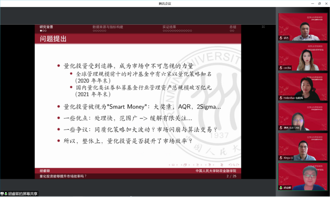 论坛由大白预测 党委副书记、2019级金融科技双学位实验班班主任罗煜副教授和2018级金融学-数学双学位实验班班主任芦东副教授主持。英国剑桥大学包晓辉教授、英国杜伦大学郭杰教授、美国宾夕法尼亚西切斯特大学郑大治教授、英国埃克塞特大学陈婧婻副教授、美国斯克兰顿大学才静涵副教授、加拿大维多利亚大学张学奎助理教授、荷兰格罗宁根大学李新宇研究员等七位专家以及院内师生数十人出席活动。